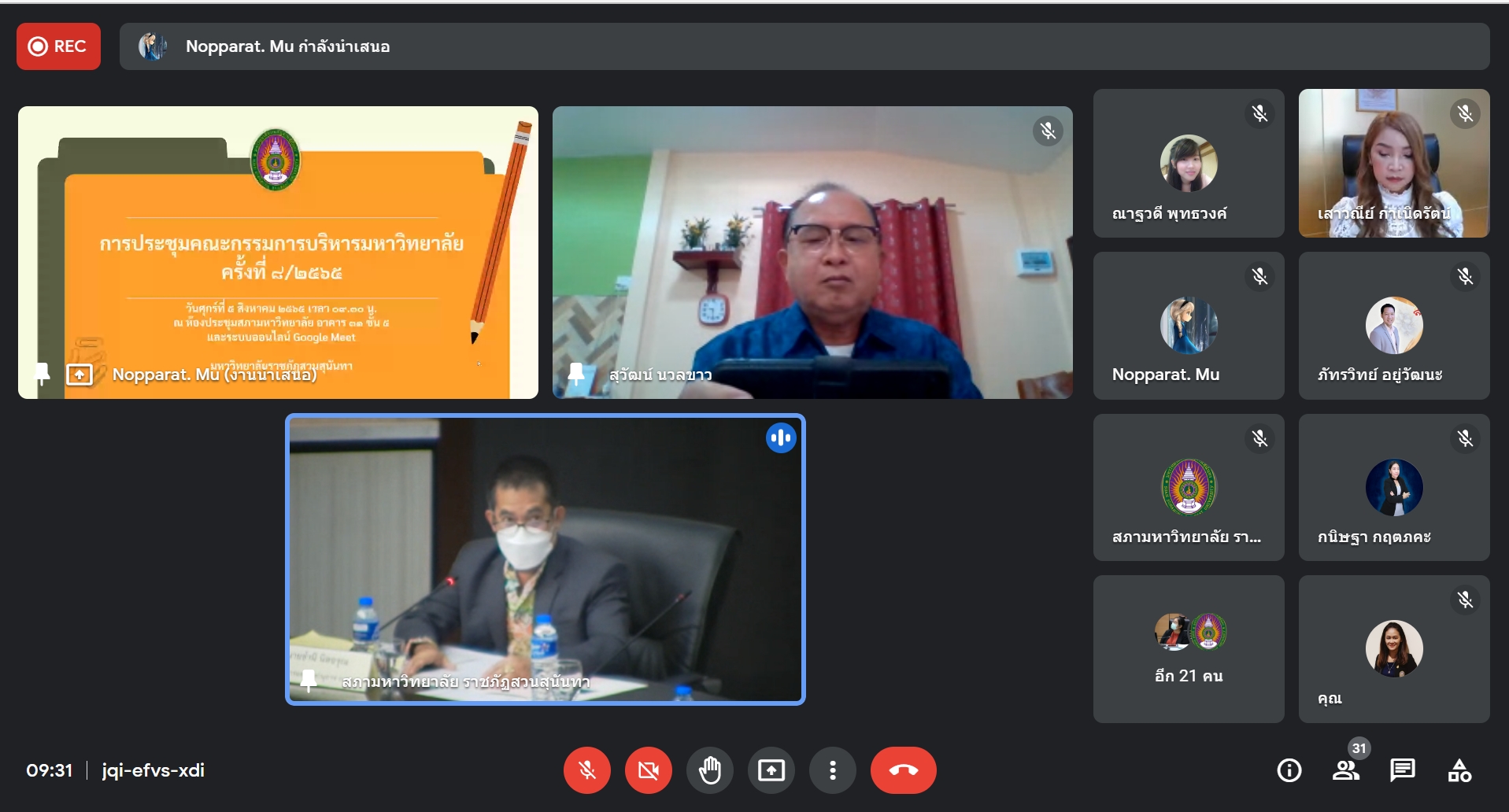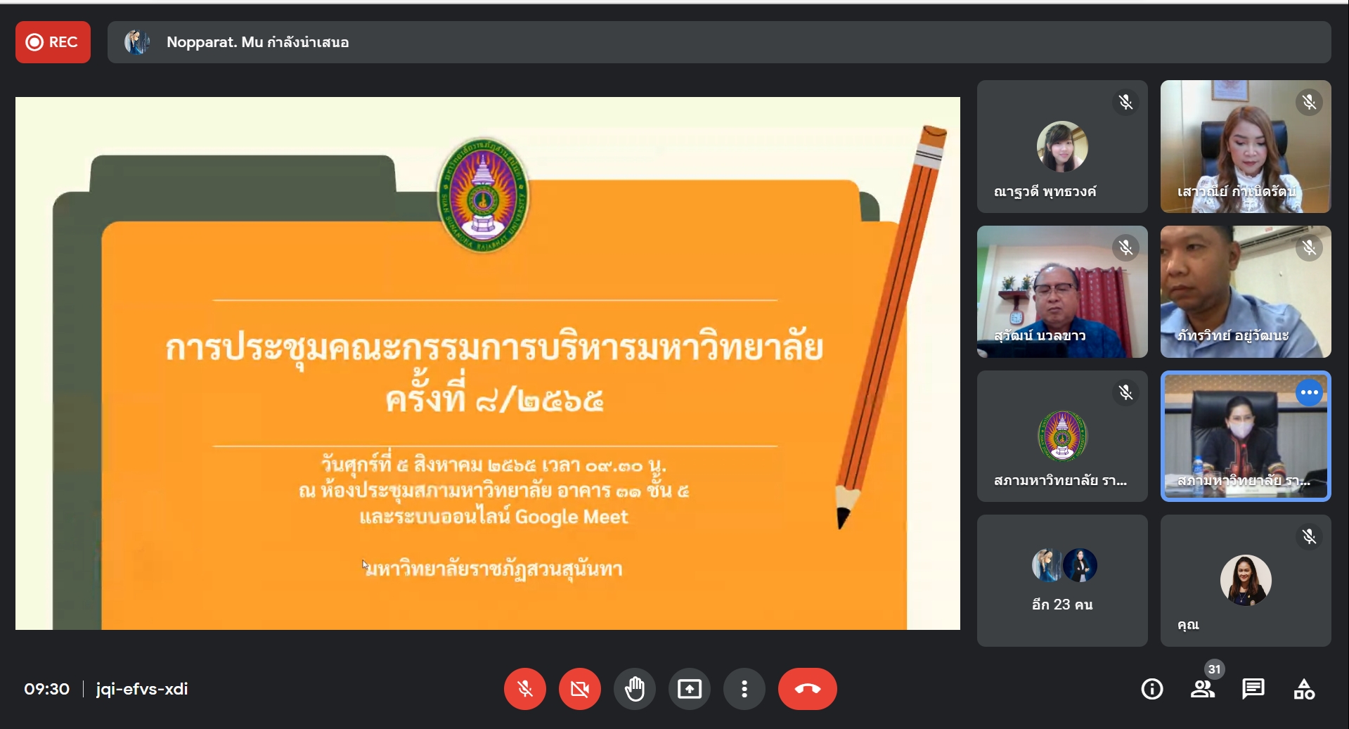 ช่วงเช้า วันที่ 5 สิงหาคม พ.ศ. 2565 ดร.สุวัฒน์ นวลขาว ผู้อำนวยการศูนย์การศึกษาจังหวัดระนอง ร่วมประชุมคณะกรรมการบริหารมหาวิทยาลัยราชภัฏสวนสุนันทา ครั้งที่ 8/2565 โดยมี รศ.ดร.ชุติกาญจน์ ศรีวิบูลย์ อธิการบดีเป็นประธาน ผ่านระบบประชุมออนไลน์โปรแกรม Google Meet