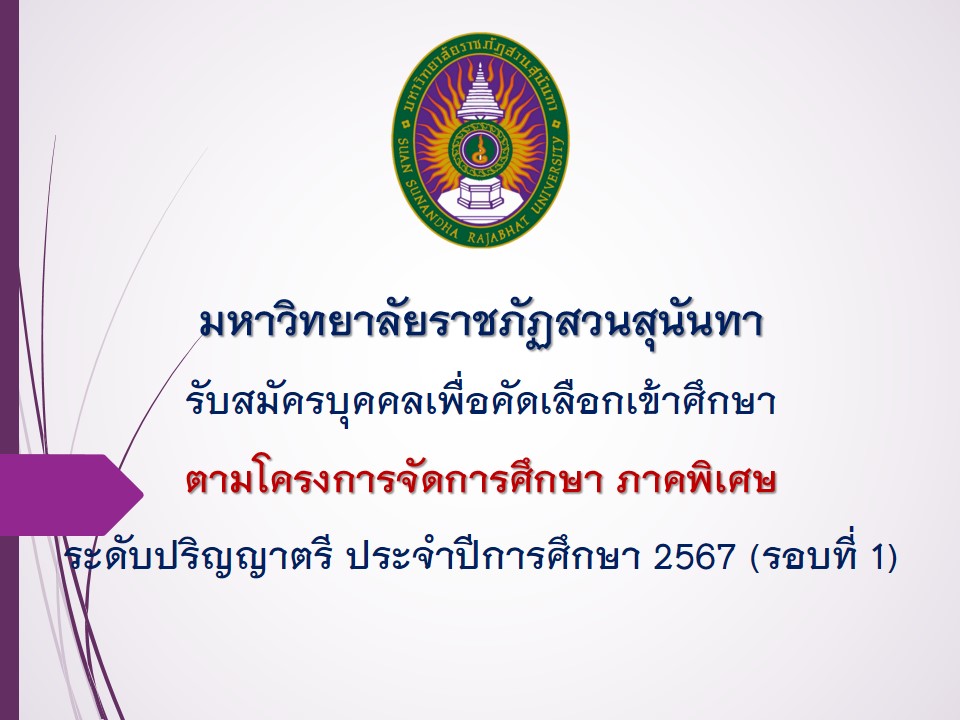 มหาวิทยาลัยราชภัฏสวนสุนันทา ศูนย์การศึกษาจังหวัดระนอง เปิดรับสมัครนักศึกษาใหม่ ตามโครงการจัดการศึกษา ภาคพิเศษ ระดับปริญญาตรี ประจำปีการศึกษา 2567 (รอบที่1) ตั้งแต่วันที่ 1 ม.ค. - 31 มี.ค. 2567 สามารถสมัครได้ที่ https://admission.ssru.ac.th/