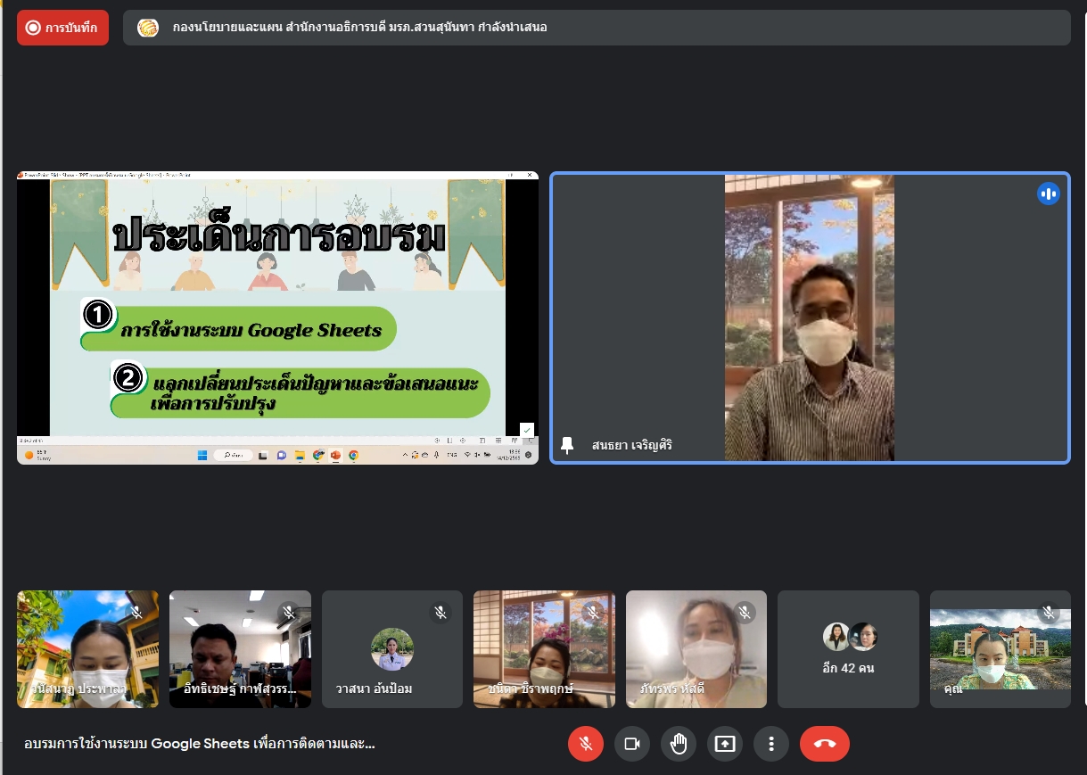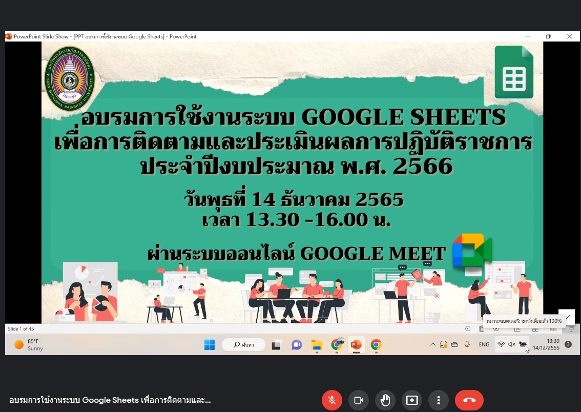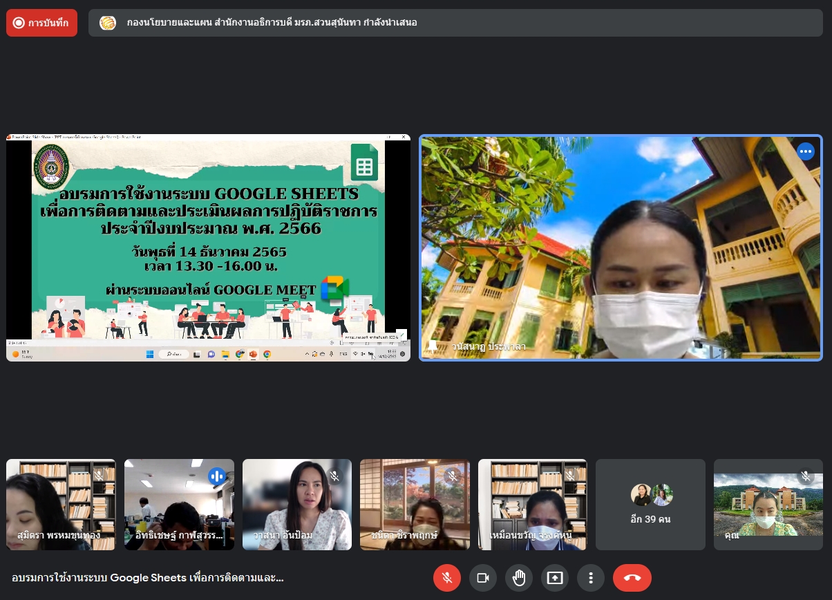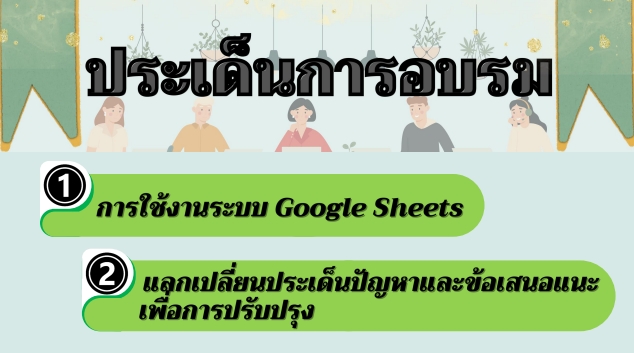 ช่วงบ่าย วันนี้(14 ธ.ค.65) นางสาววนัสนาฏ ประพาลา รักษาการหัวหน้าสำนักงานศูนย์การศึกษาจังหวัดระนอง และนางสาวพรัชษกรณ์ เกตุลิขิตกุล นักวิเคราะห์นโยบายและแผนเข้าร่วมการอบรมการใช้งานระบบ Google Sheets เพื่อการติดตามและประเมินผลการปฏิบัติราชการ ประจำปีงบประมาณ พ.ศ.2566 ผ่านระบบการประชุมออนไลน์ โดยมีประเด็นการอบรม 2 ประเด็น ได้แก่